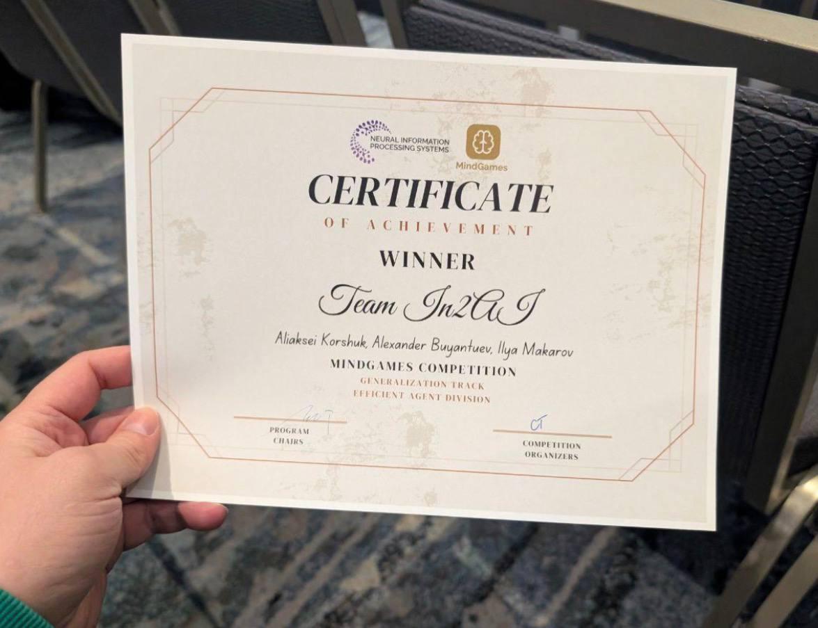 Соревнование MindGames Arena проводится как часть одной из ключевых конференций в области ИИ NeurIPS 2025 и проверяет, могут ли агенты демонстрировать социально‑стратегические способности — моделировать убеждения других, обнаруживать обман, координироваться и планировать в многоходовых взаимодействиях — все это, общаясь на естественном языке. Команда In2AI Института AIRI, стартапа Coframe и Университета Иннополис заняла первое место в треке Generalization в двух категориях: