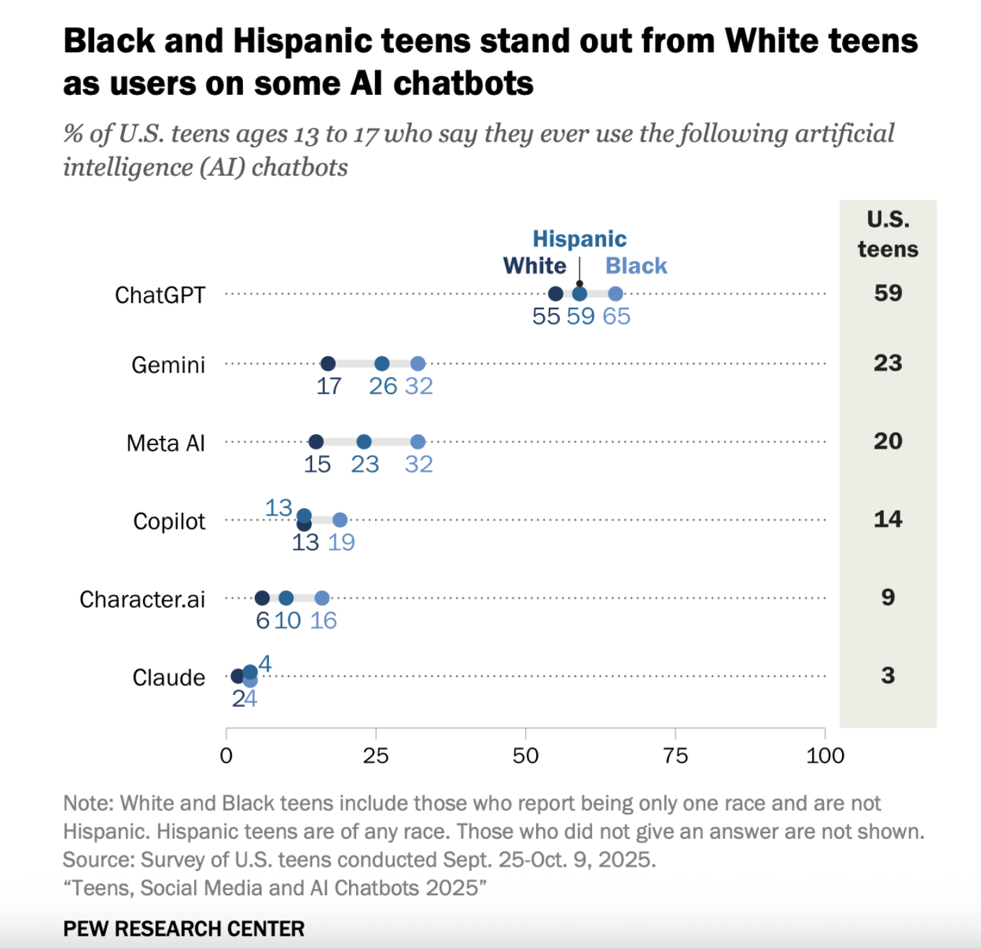 Различия в использовании чатботов среди подростков заметно проявляются в зависимости от расы, возраста и уровня дохода. По данным Pew, афроамериканские и латиноамериканские подростки используют чатботы значительно активнее — 68% против 58% среди белых сверстников. Особенно выделяется использование Gemini и Meta AI: афроамериканские подростки обращаются к этим сервисам примерно вдвое чаще. Более старшая возрастная группа — подростки от 15 до 17 лет — также демонстрирует большую вовлечённость по сравнению с 13–14-летними.