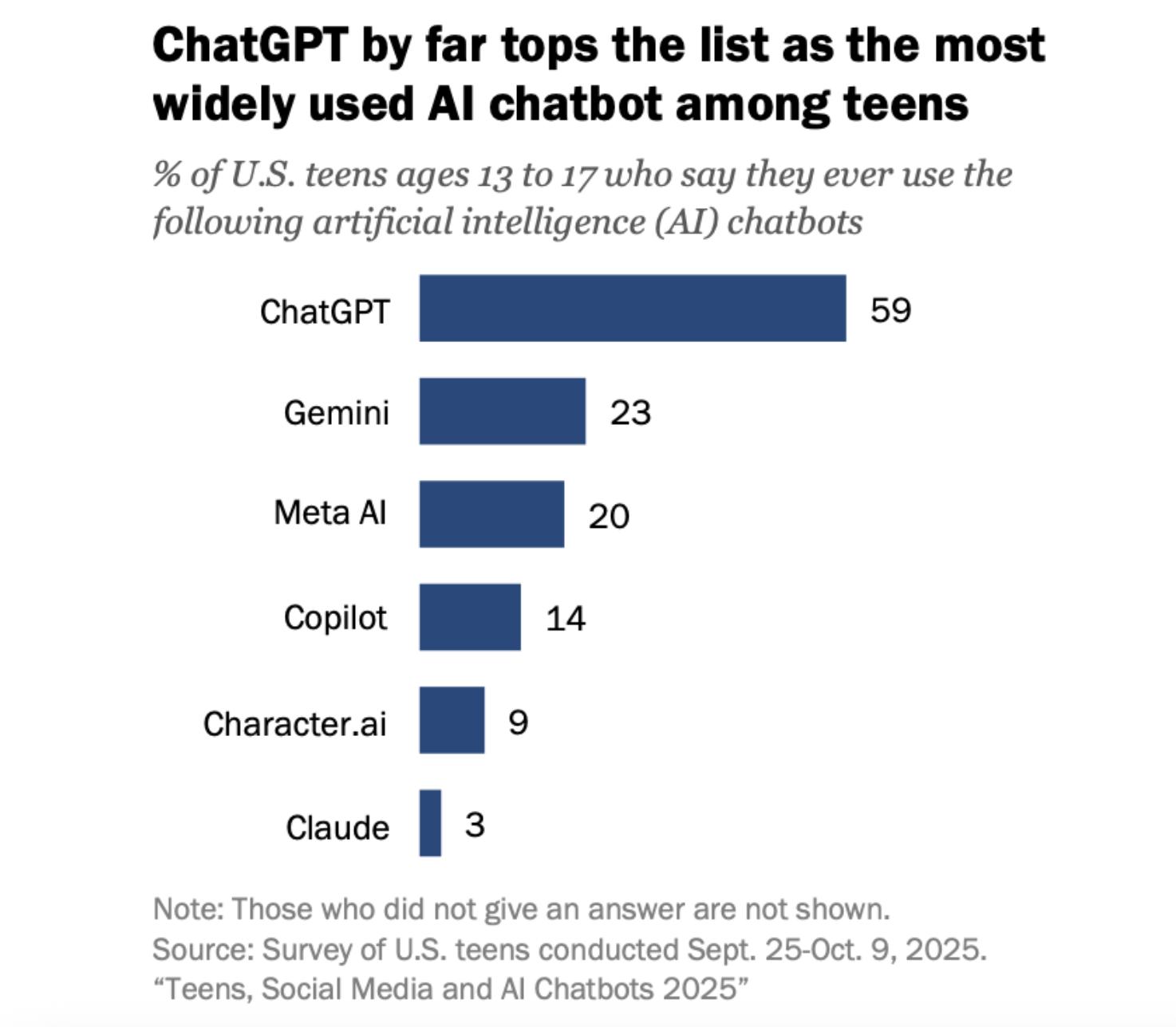 С распространением ИИ инструментов в США чатботы постепенно становятся частью подростковой рутины. Каждый третий подросток пользуется ими ежедневно, а 4% — почти без перерыва. Наиболее популярным оказался ChatGPT (59%), затем идут Google Gemini (23%) и Meta AI (20%).