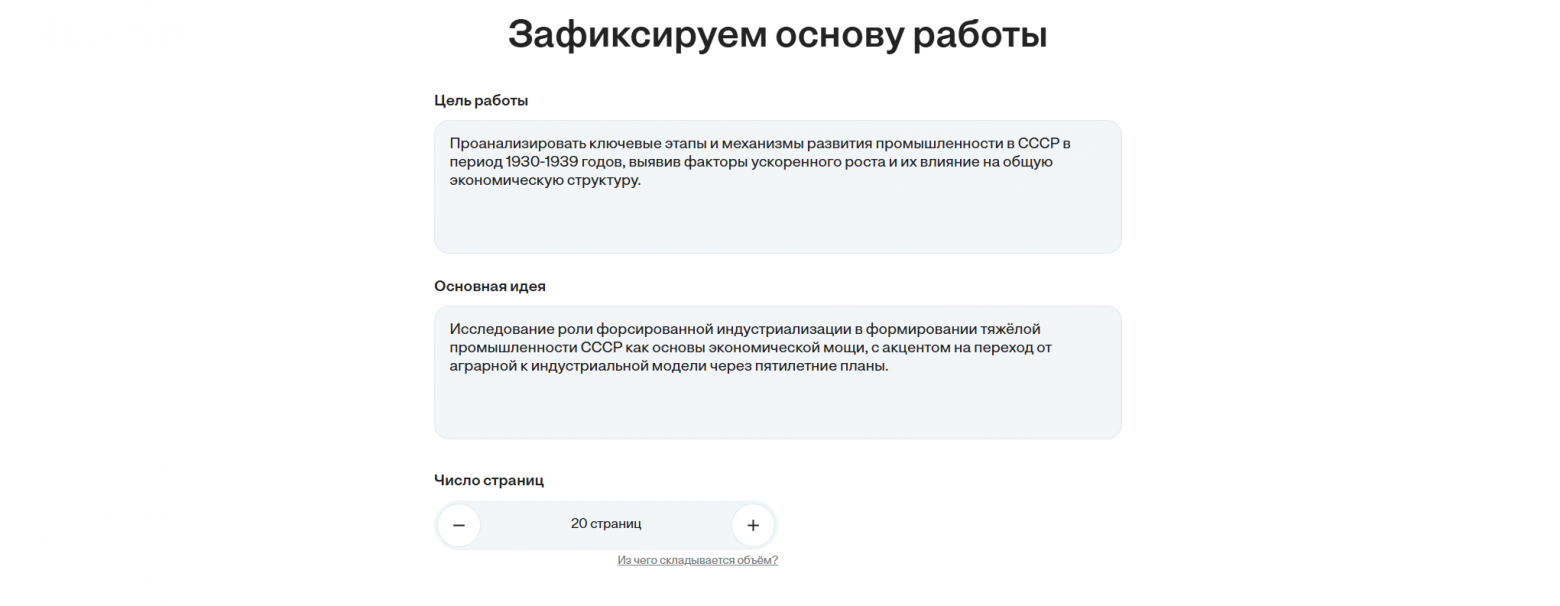 Настройка объема: Укажите необходимое количество страниц (например, 20-25 страниц для теории). Это даст нейросети сигнал раскрывать тему глубоко, с деталями и терминами, а не поверхностно.