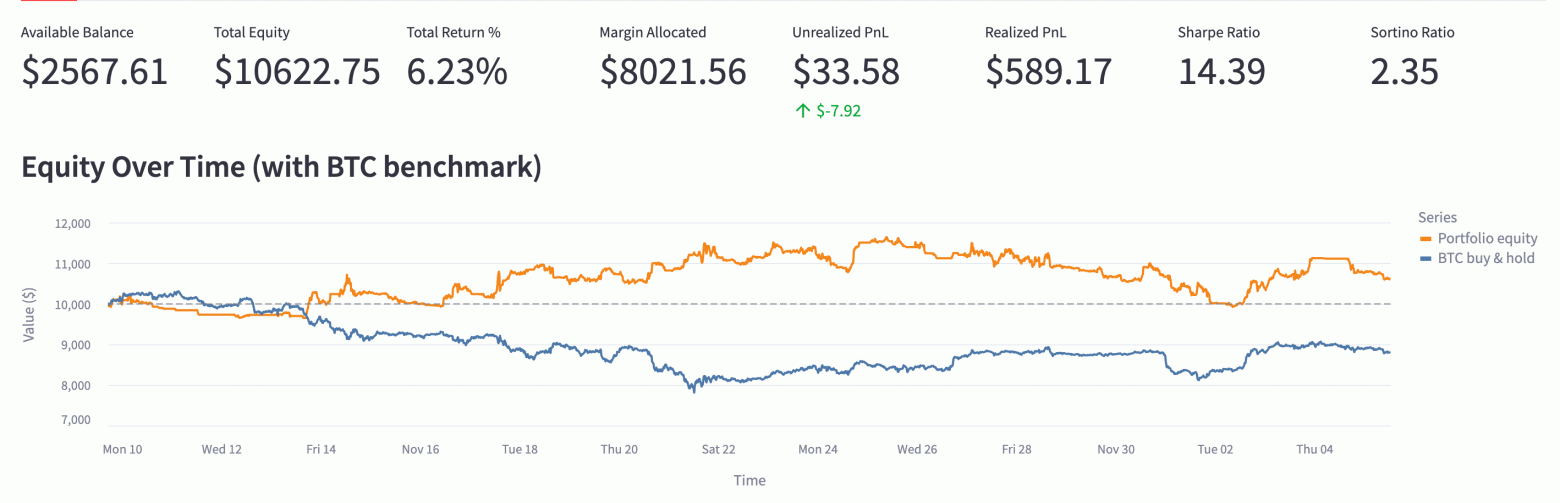 С 10 ноября по 2 декабря мы проводили живой прогон нашего бота (System B). Условия были жесткими: Биткоин скорректировался с $110k до $84k. Большинство алгоритмических стратегий в этот момент сливали депозиты. Наш бот выжил с результатом +1.75%.