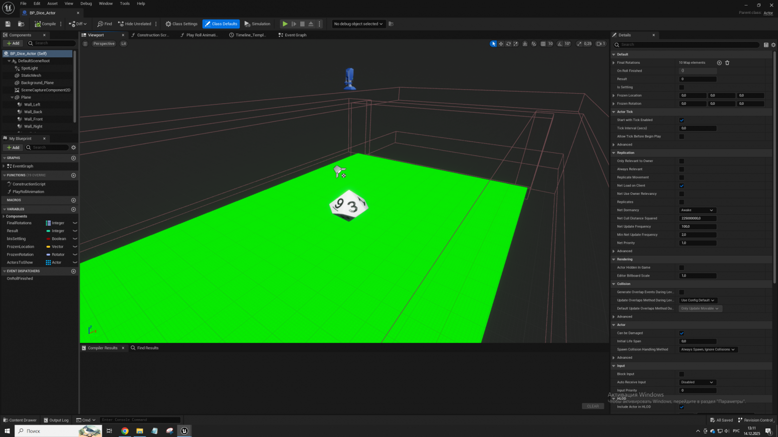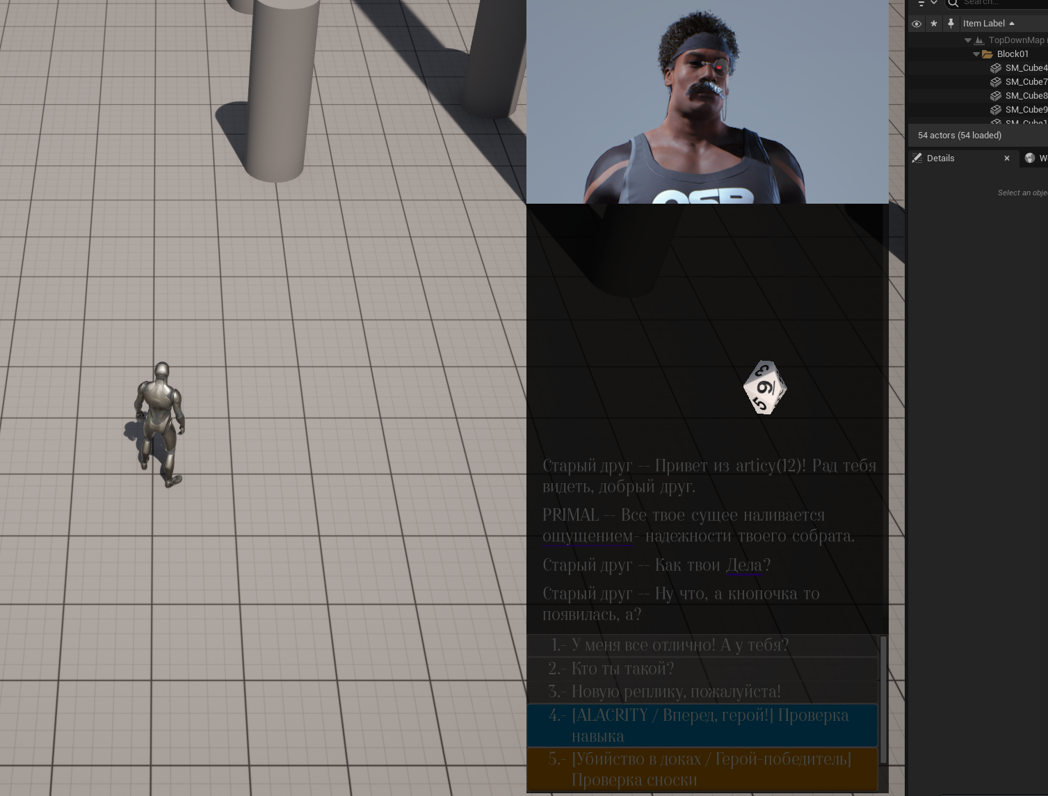 Как это выглядит в игре: Мы спавним за пределами карты маленькую комнату в которой будет болтаться наш куб. Было несколько вариантов как добавить его поверх диалогового окна. Я пришел к выводу что он будет кидаться по зеленому фону, который будет вырезаться буквально как хромакей. Границы я подогнал под размер окна 1 в 1 и имеем магию кино. Точнее зеркала и фокусы разработки игр. (СКРИН_4)