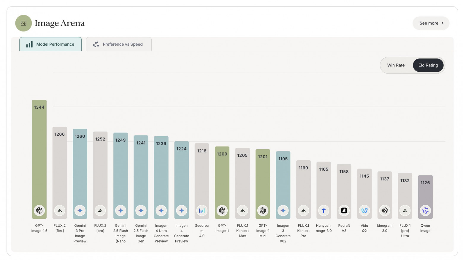 OpenAI представила обновленную модель генерации изображений GPT Image 1.5. Она доступна всем пользователям ChatGPT, включая бесплатных, а также разработчикам через API. Главные улучшения — скорость генерации выросла до четырех раз, а модель точнее следует инструкциям. Модель заняла первое место в рейтинге Image Arena со значительным отрывом от Flux.2 и Gemini 3 Pro Image (Nano Banana Pro).