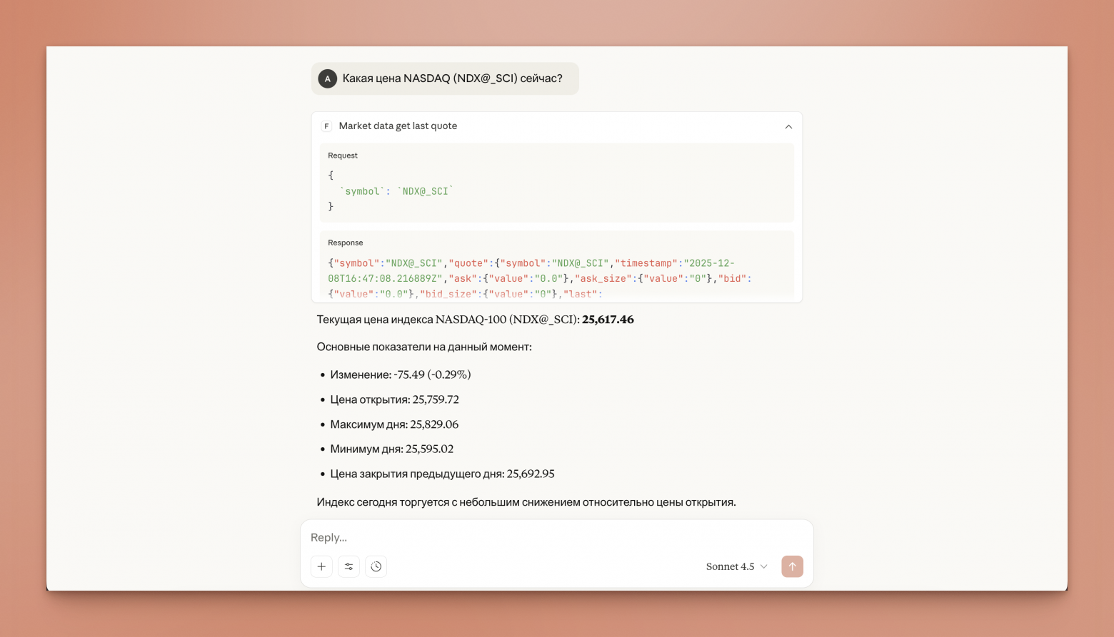 Помимо Market Data, Trade API предоставляет еще много возможностей: анализ портфеля, данные об инструментах, управление ордерами — которые тоже можно подключить к ИИ. Следите за обновлениями.