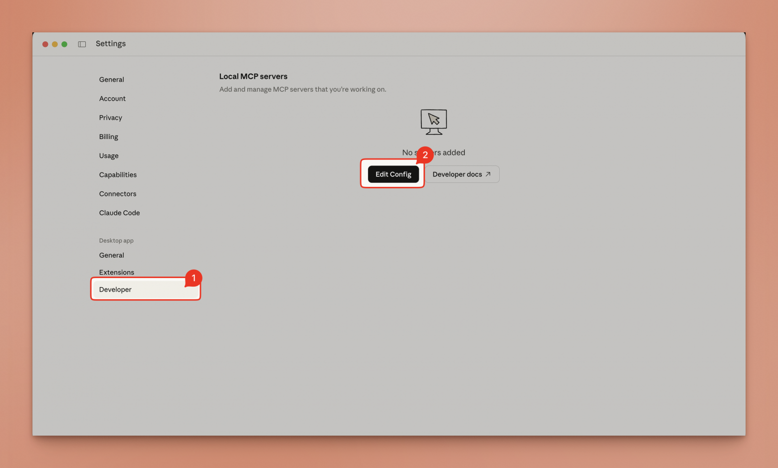 Откройте Claude Desktop. Нажмите на ваш аккаунт → Settings → Developer → Edit Config.