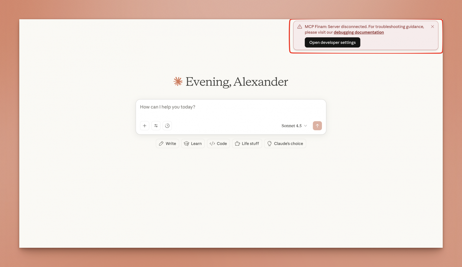 Если появилась ошибка — проверьте правильность API-ключа и номера счета в конфигурационном файле claude_desktop_config.json, пересохраните и повторно откройте приложение, полностью завершив его в трее.