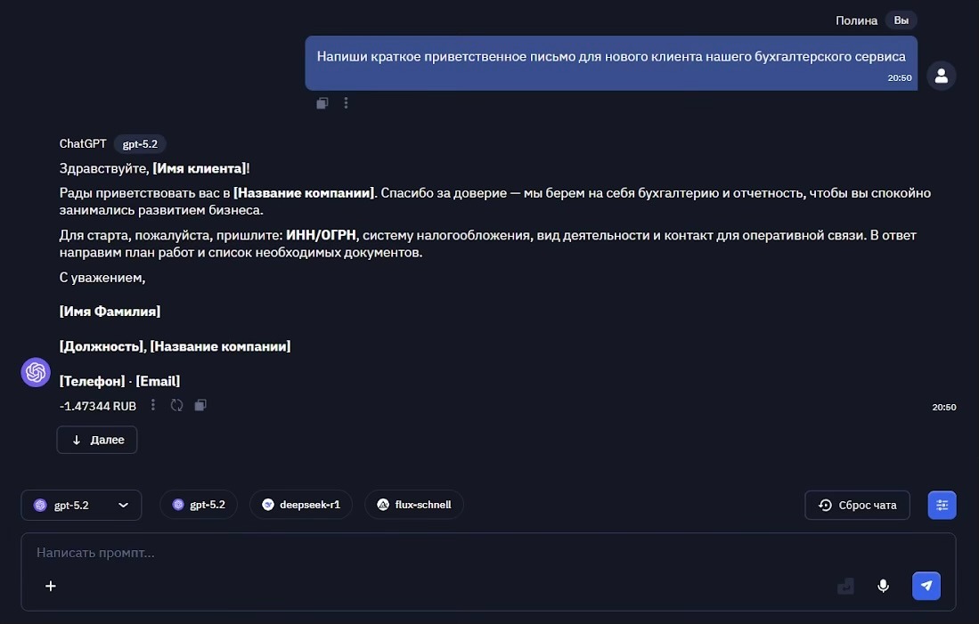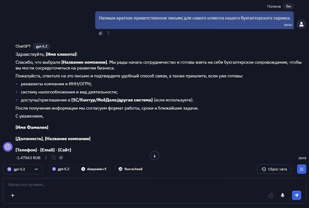 Как это работает на практике? Я буду тестировать самую последнюю модель GPT-5.2 на платформе BotHub. Список нейросетей там обширен - от работы с текстом до транскрибации и генерации видео. По специальной ссылке для регистрации можно получить 100 000 капсов для собственных экспериментов.