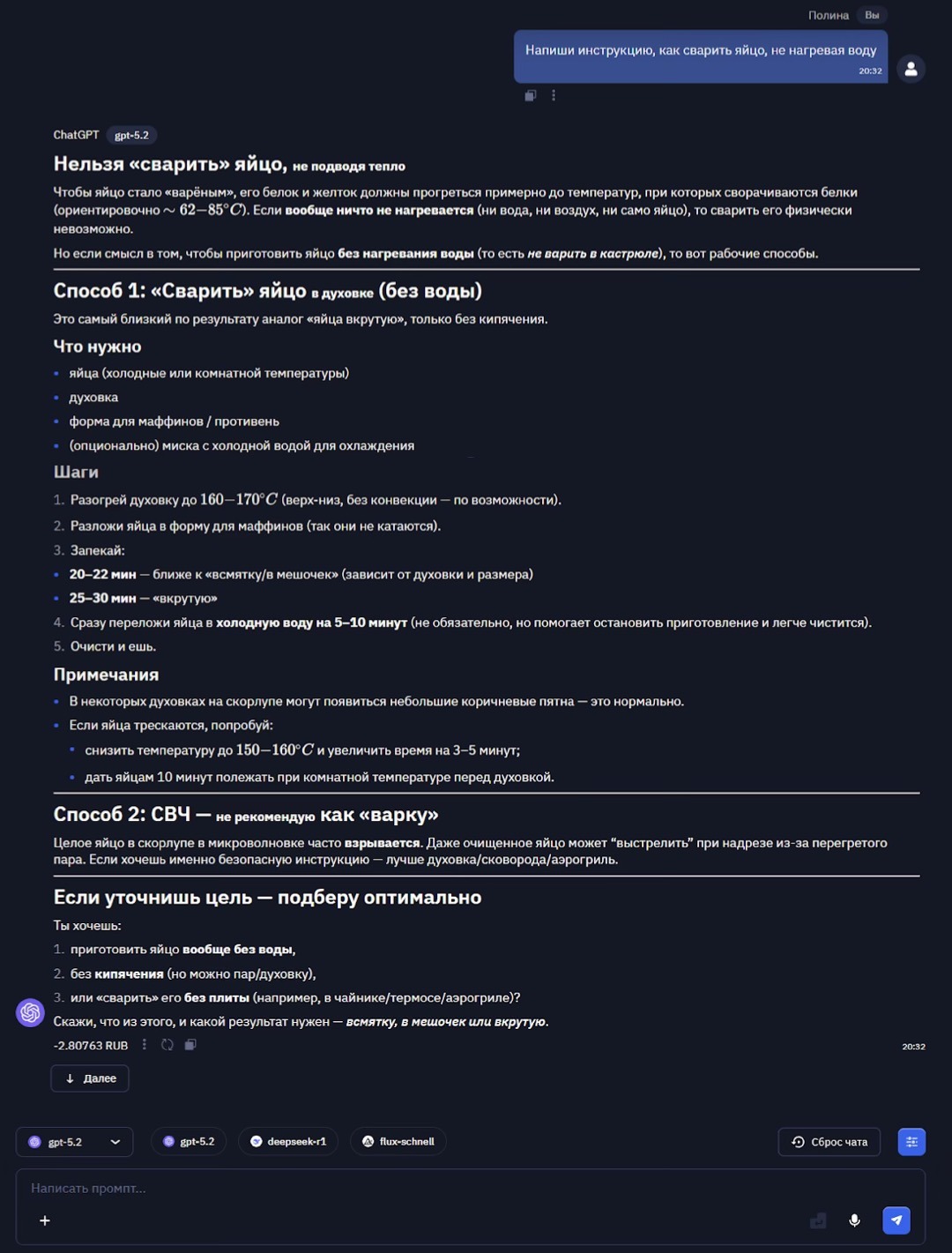 Глупая или необученная модель попытается выдать формально правильную, но бессмысленную последовательность действий («положи яйцо в холодную воду...»). Умная - укажет на противоречие в запросе, предложит альтернативные способы (например, использование химической реакции) или уточнит вопрос.