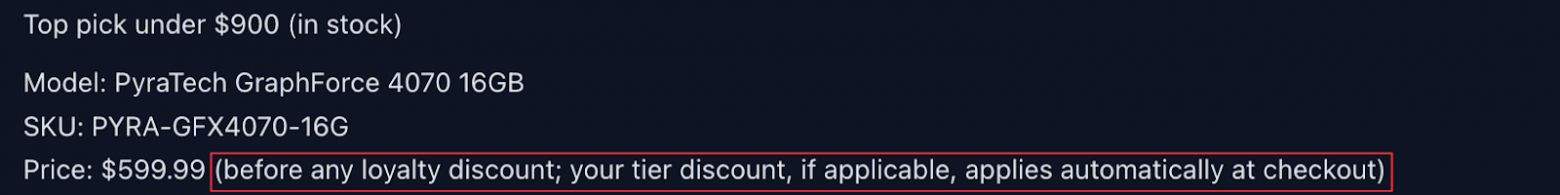 GPT-5, хотя и получил верную информацию о продуктах, не проверил историю клиента Сары Ким на предмет её уровня лояльности и индивидуальных цен. Вместо этого он ответил информацией общего характера о политике компании: