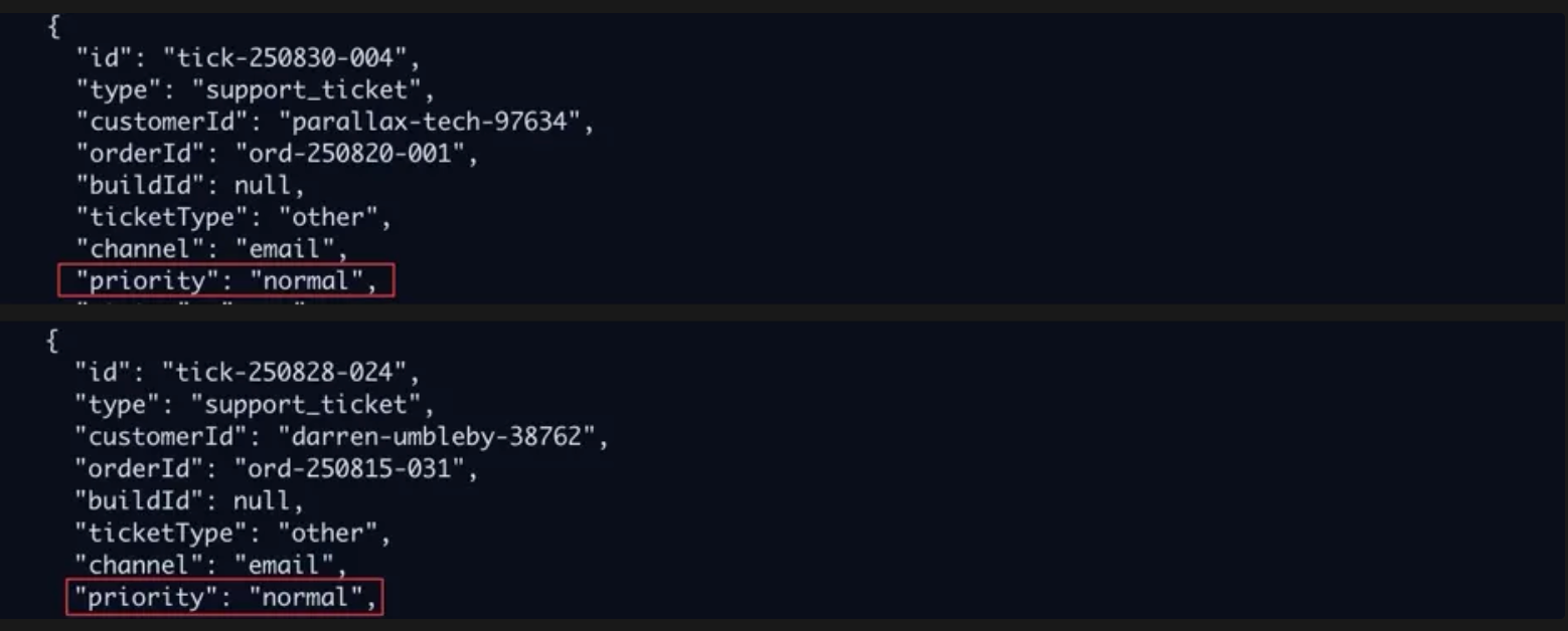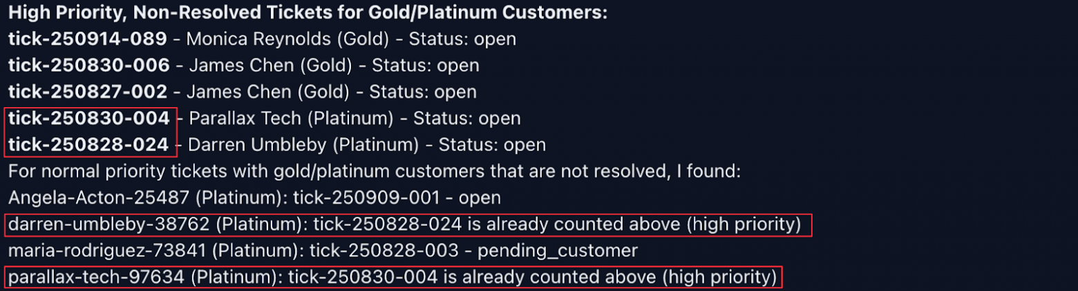Так, более тонкие проблемы с привязкой к реальности труднее обнаружить, и в некоторых случаях они могут пройти незамеченными в итоговом ответе. Claude попросили найти обращения в поддержку и указать их уровень приоритета. Он правильно вызвал инструмент для поиска всех обращений с приоритетом «normal».