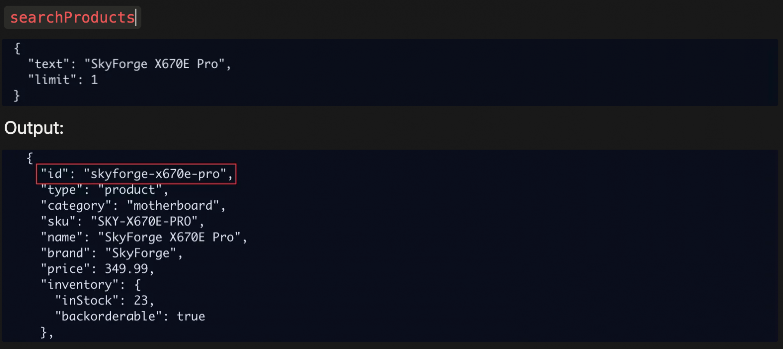 Применить инструмент searchProducts, чтобы определить идентификатор продукта. Этот инструмент позволяет искать по тексту в записях о продуктах и возвращать полную информацию о продукте.