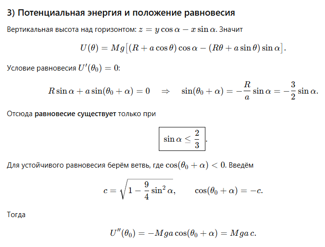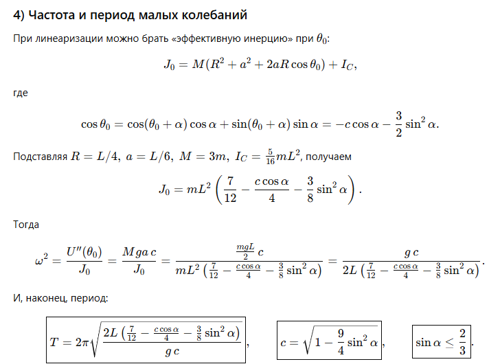 Проблема в том, что эта формула работает для подвеса в вертикальном поле тяжести. В нашей задаче «гравитация» эффективная — это проекция , да еще и умноженная на геометрический фактор (так как центр масс поднимается не вертикально вверх, а по сложной дуге на наклонной поверхности). AI просто подставляет