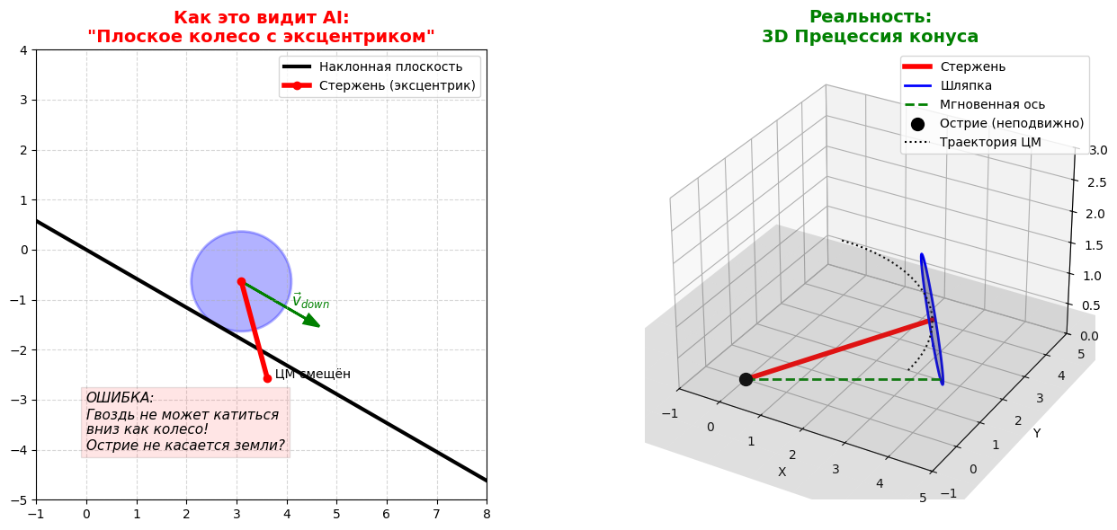 Ошибка размерности пространства: гвоздь — это 3D-объект. Он опирается на острие и край шляпки. Он не может катиться плоско, как колесо. Модель упростила задачу до 2D (Planar motion), убив всю суть кинематики конуса.