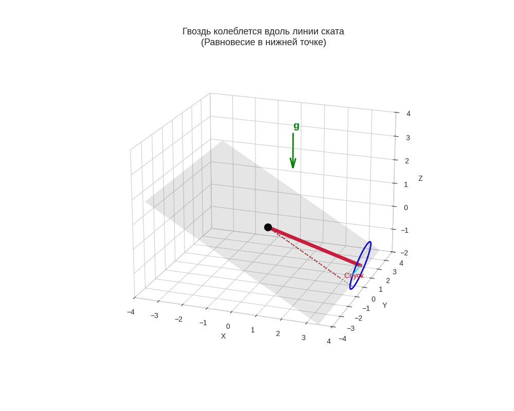 Колебания вокруг положения равновесия, при котором центр масс на одной вертикали (вдоль , перпендикулярно наклонной) с точкой