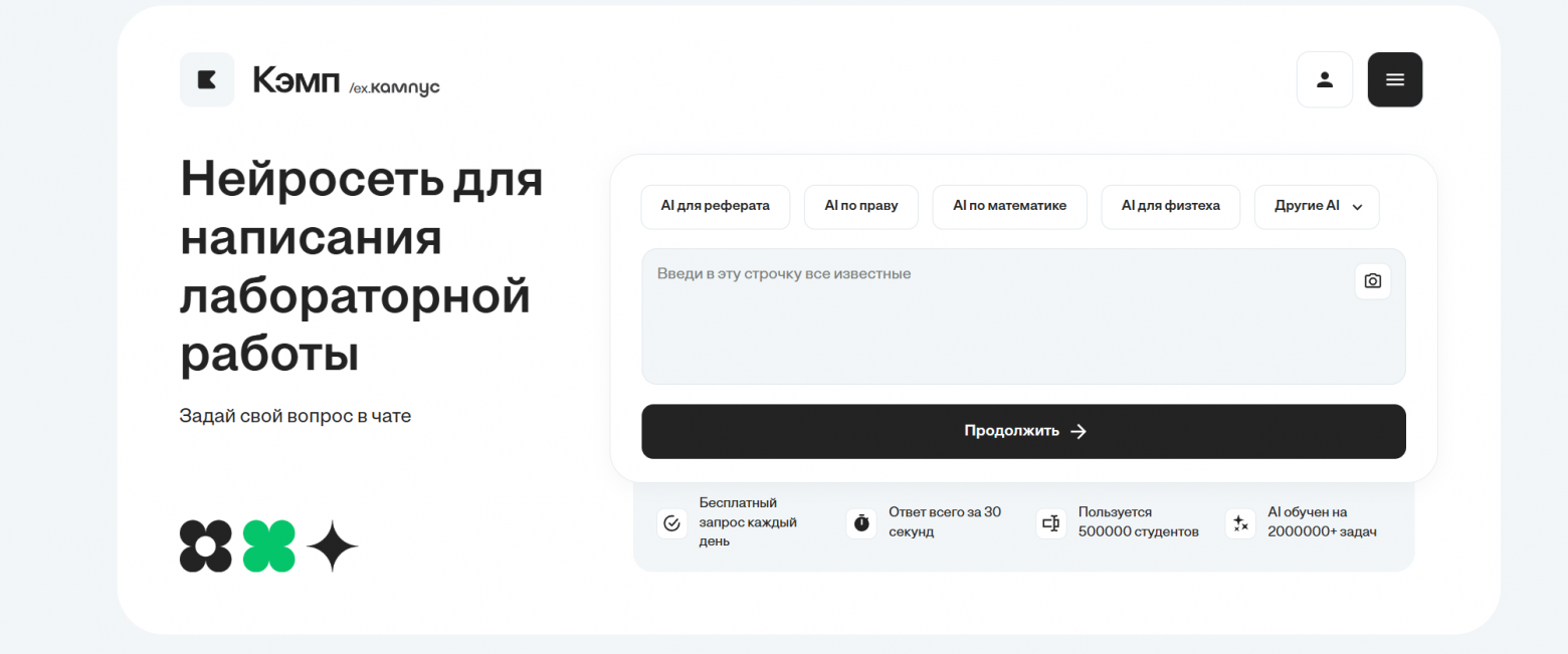 Когда речь заходит про написание лабораторной работы, важно, чтобы инструмент понимал специфику российского образования. Сервис Кэмп — это не просто чат-бот, а полноценная экосистема для студентов и школьников, разработанная специально для работы со сложными академическими форматами.