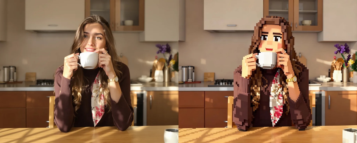 Преобразуйте исходную фотографию в изометрическую 3D‑сцену в стиле воксель‑арта Minecraft. Сохраните оригинальную композицию, цвета, позы и ключевые детали. Всё должно быть собрано из маленьких кубиков при ярком нейтральном освещении. Чёткие грани, лёгкий ambient occlusion, ультрачистое исполнение, 8K. Негативный промпт: фотореализм, плавные градиенты, изогнутые поверхности, размытие, водяные знаки, лишний текст, многоблочное дробление лица.