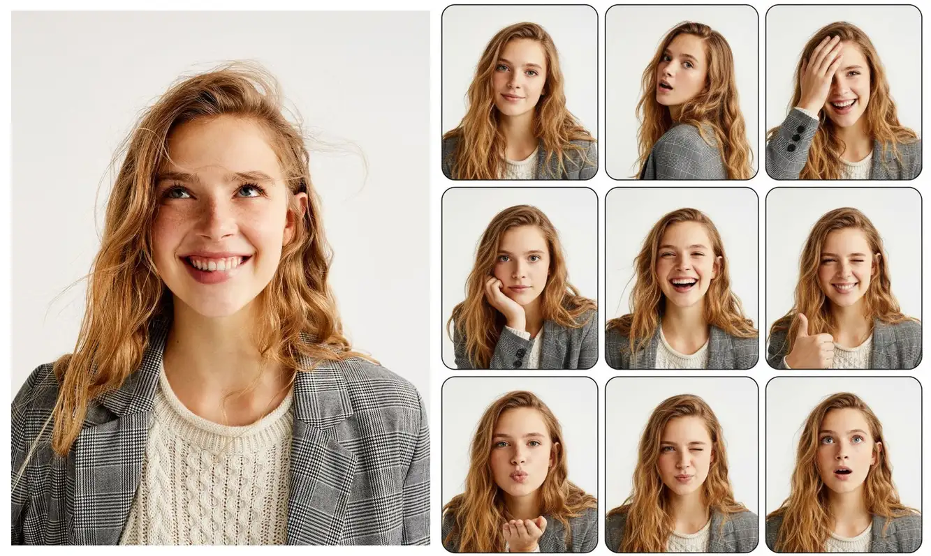 Используя исходную фотографию, сделайте сетку фотографий 3×3: каждый кадр — с другой позой и другим выражением лица, без повторов.