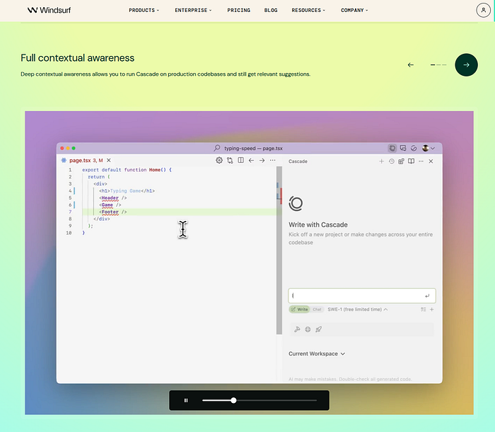 Best for: Developers seeking an AI-first IDE that can manage entire projects and handle both code generation and execution. The real-time preview and cascade context make it suitable for modern web and mobile development.