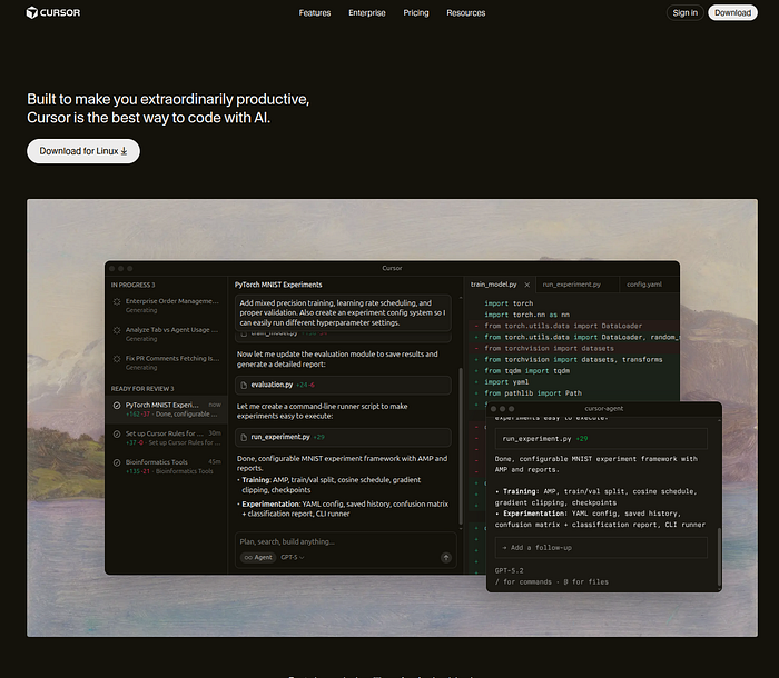 Best for: Developers who want an AI-enhanced editor that remains familiar to VS Code users. It excels at orchestrating multi-file refactors and implementing high-level tasks via agent mode.