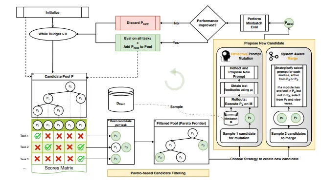Он использует оптимизацию по Парето, чтобы поддерживать несколько эффективных промптов, а не один. Он также использует рефлексию, обучаясь на ошибках путем чтения текстовой обратной связи и внесения исправлений.