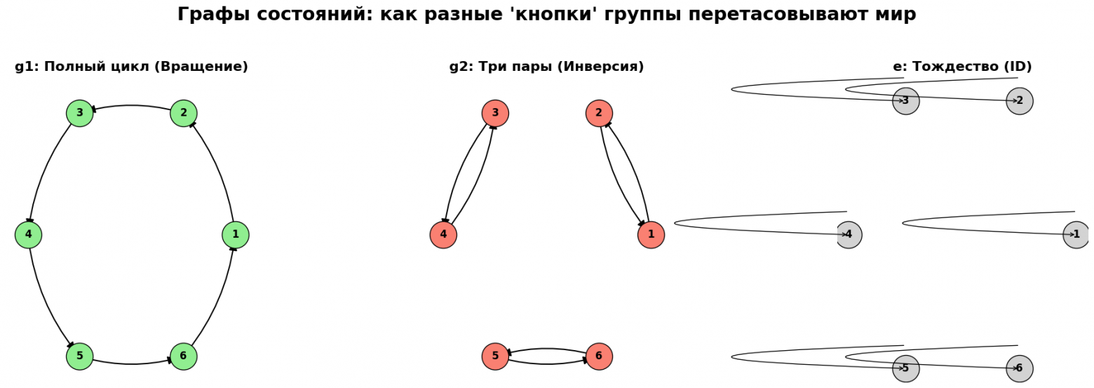 Обратимость: раз наш граф состоит из циклов, мы всегда можем «прокрутить» его назад. Это и есть обратный элемент. Если бы была кнопка, переводящая все состояния в одно («Черная дыра»), у нее не было бы обратной кнопки — и теория групп тут же бы закончилась.