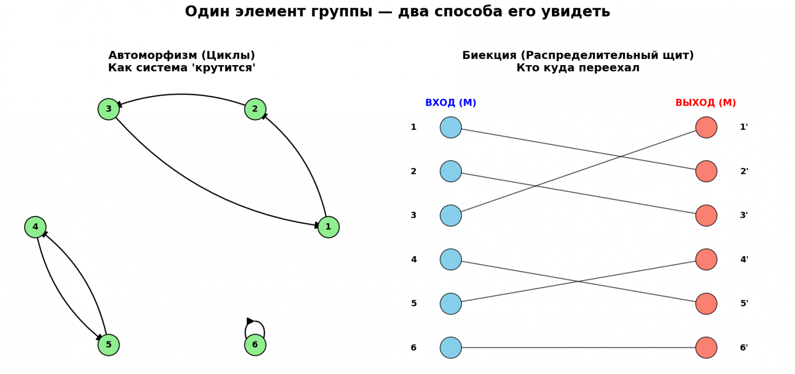 Мы покажем на одном рисунке, как одно и то же действие выглядит как «Циклы» (динамика) и как «Двудольный граф» (структура отображения).