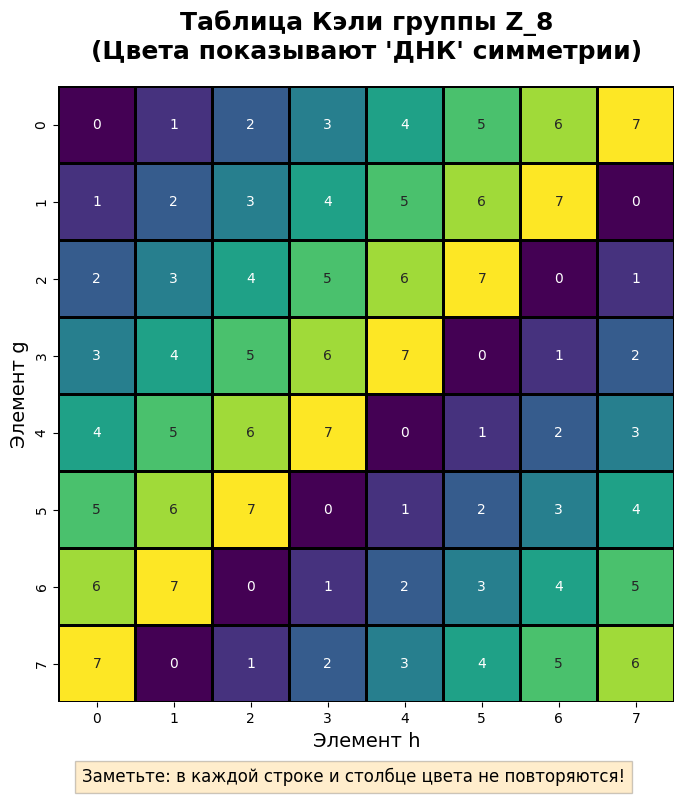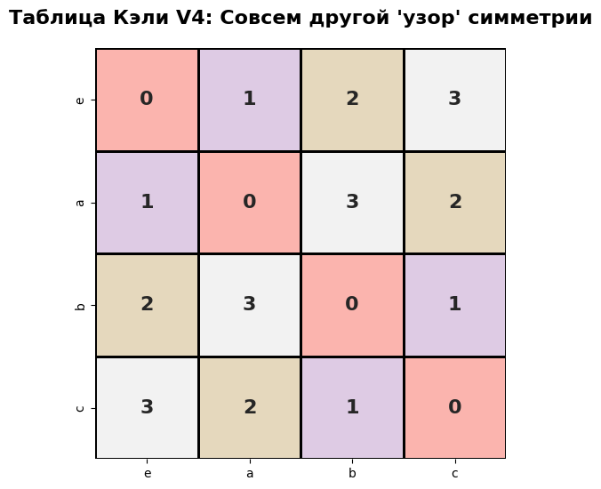 Чтобы увидеть структуру группы, мы раскрасим таблицу Кэли. Каждому элементу — свой цвет. В «здоровой» группе цвета образуют симметричные узоры, похожие на орнаменты.