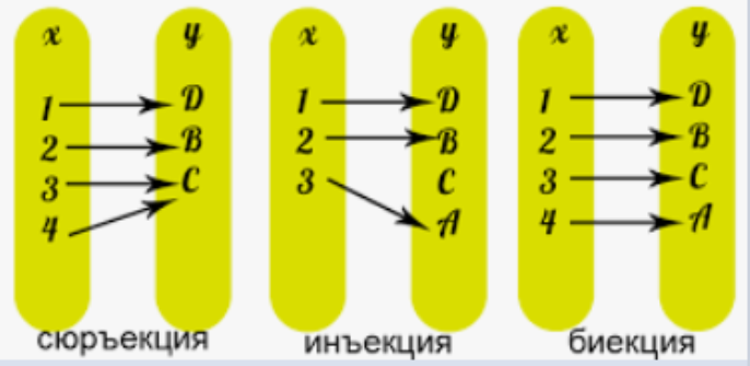 Биекция: это отображение, которое каждому элементу слева сопоставляет ровно один элемент справа, и наоборот. Нет «брошенных» элементов и нет ситуаций, когда два провода втыкаются в одно гнездо.