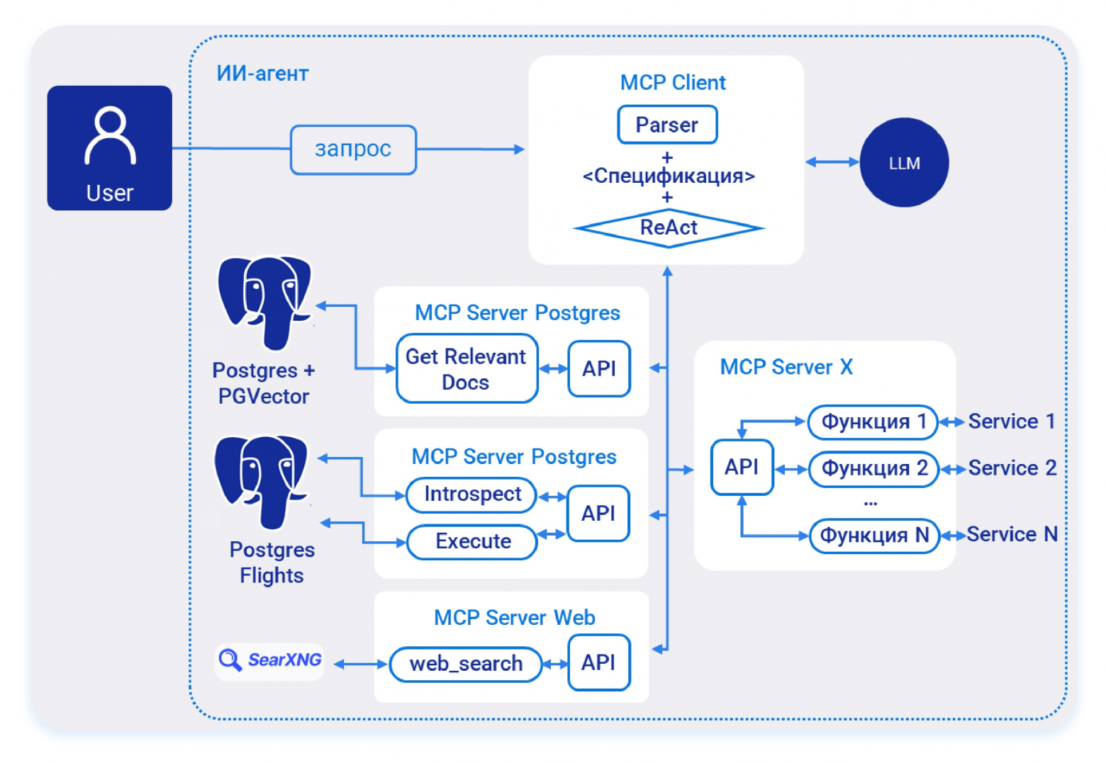 Классический чат с документацией быстро перестал устраивать: пользователям нужен полноценный ассистент с чёткой ролевой моделью и множеством разных инструментов. Поэтому вокруг RAG вырос ReAct-агент, который через Model Context Protocol (MCP) умеет ходить в PostgreSQL, обращаться к веб-поиску и комбинировать эти источники в одной цепочке рассуждений.