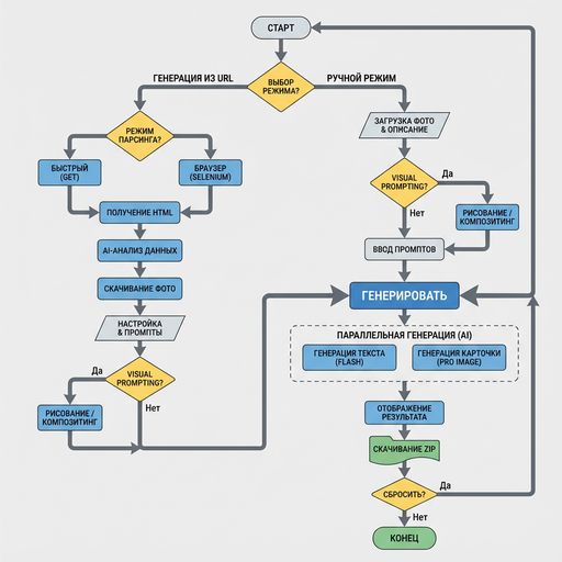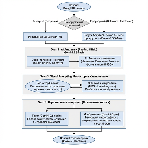 Ранее я рассказывал, как реализовал автоматический парсинг контента и генерацию карточек с помощью nano banana pro (ниже почему именно об этих инструментах я упомянул). Сейчас я хочу погрузиться в тему генерации контента, а конкретно карточек для маркетплейсов, более подробно. Я захотел переработать свой инструмент, превратив его из набора функций в более удобный инструмент. Мне нужно было получить более автоматизированный инструмент и как раз для этого мне пригодился опыт разработки предыдущих механизмов: автоматический парсинг и генерация карточек. Напомню кратко об этих инструментах, чтобы продолжить в их контексте повествование.