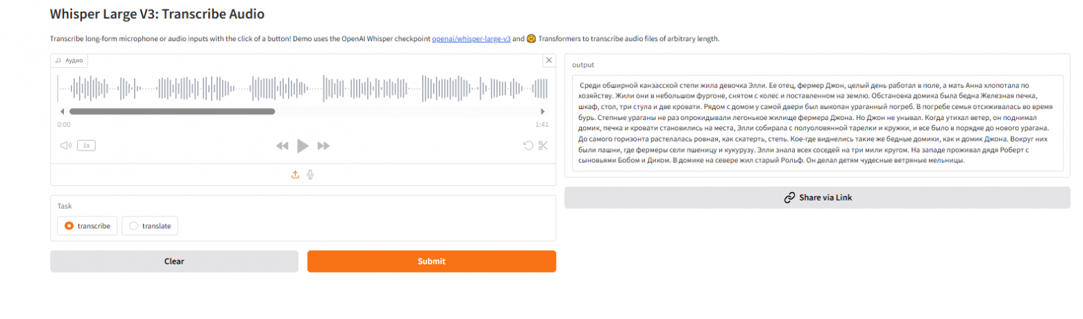 Интерфейс Hugging Face Space максимально упрощен. Пользователь загружает файл или использует микрофон, после чего модель обрабатывает аудио на серверах Hugging Face и выводит готовую транскрипцию.