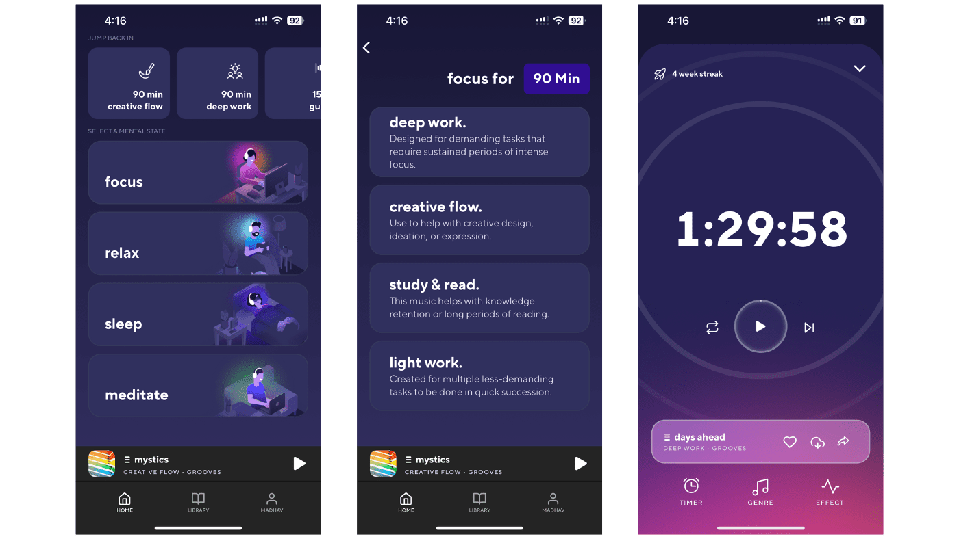 Проблема заключается в том, что человеку сложно быстро и эффективно перейти в режим продуктивной работы, особенно в условиях информационного перегруза, прокрастинации или усталости. Обычные музыкальные композиции часто отвлекают (из-за текстов, эмоциональных ассоциаций или резких переходов), а полная тишина может не обеспечивать достаточной стимуляции.