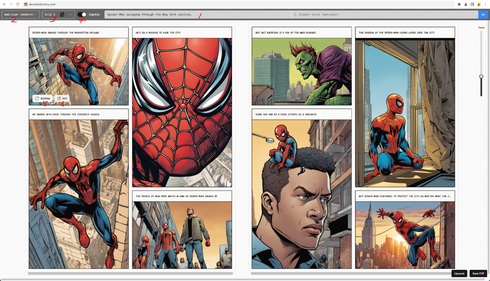 Генерируйте и дорабатывайте. ИИ создает все изображения. Если что-то не понравилось, можно мгновенно перегенерировать отдельную панель, отредактировать текстовую подсказку или добавить/исправить речевые пузыри и подписи.