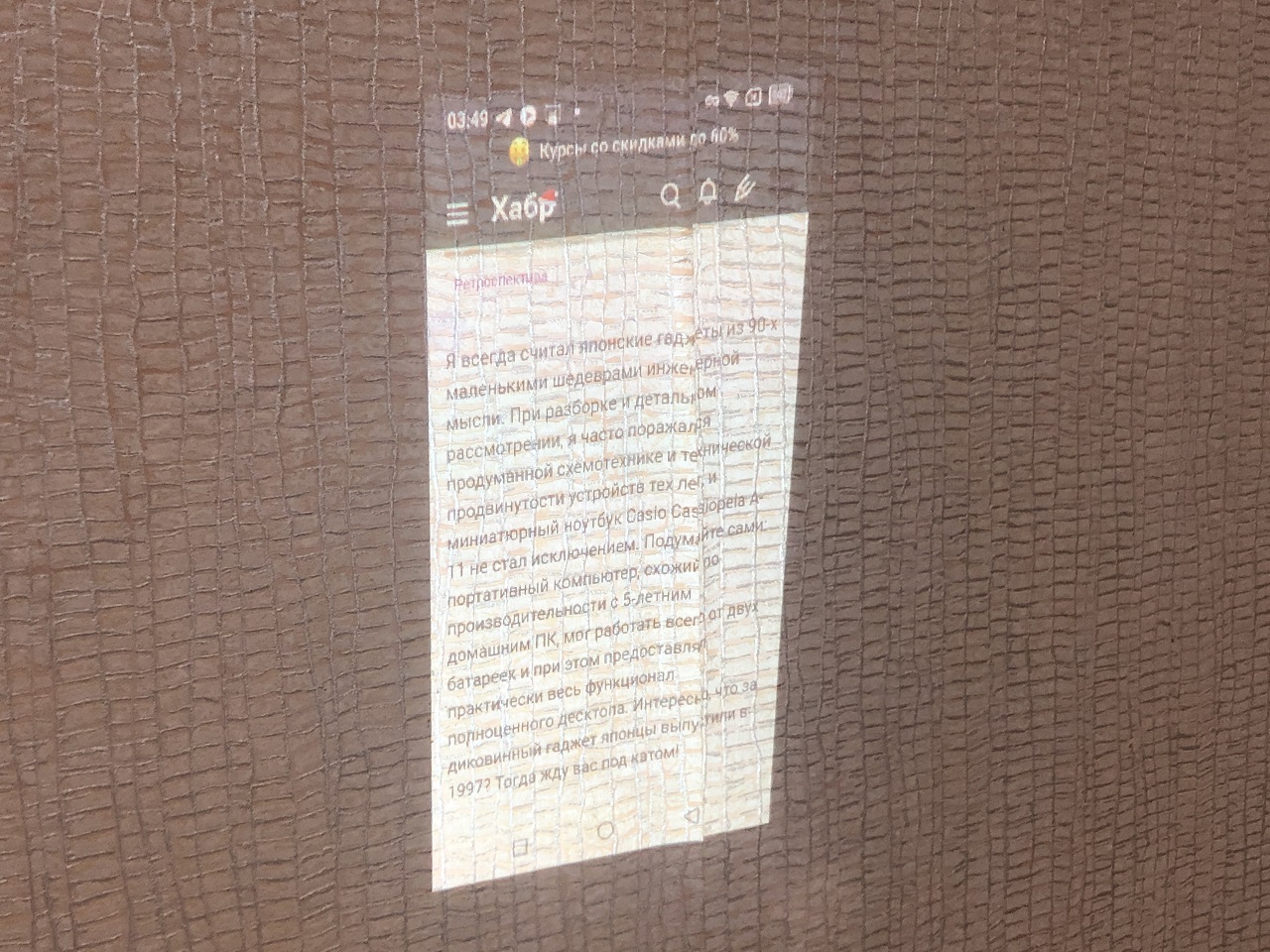 Куда-ж без тестов главной фичи устройства - проектора! И здесь, на удивление, с ним всё очень хорошо. К сожалению в моей коллекции нет ни одного смартфона с проектором для сравнения, даже Galaxy Beam, так что говорить буду опираясь на личные ощущения.