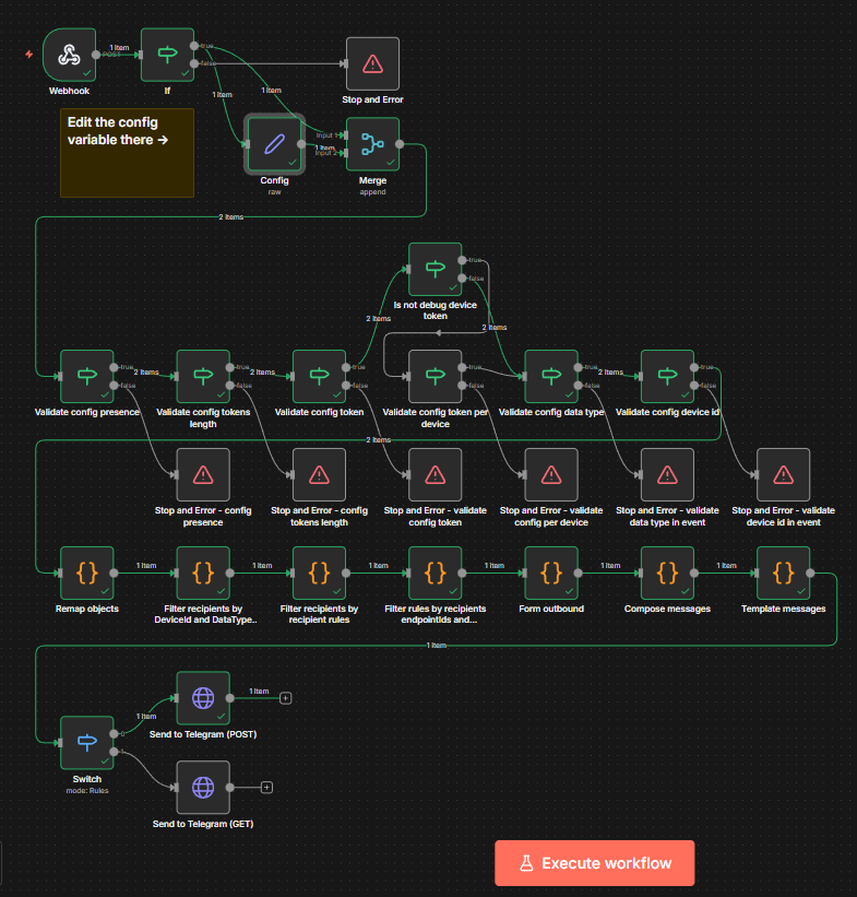 Есть единый конфиг, полностью и почти что в императивном стиле описывающий, что принимать, как обрабатывать, в каком виде рендерить и куда слать. Входящий webhook принимает HTTP-запросы от смартфонов (MacroDroid/Tasker), затем просто происходит цепочка маппингов и темплейтингов, заигрывания с сырыми данными и по конвейеру выдающему последней ноде список адресов и payload, куда и как слать запросы.