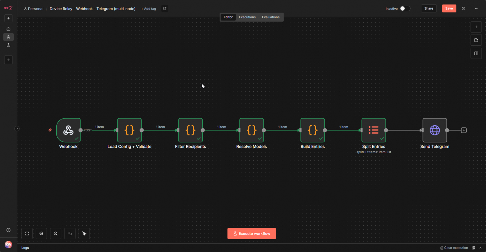 TL;DR Автор в прошлой статье настроил Telegram-чат, куда несколько смартфонов скидывают пуши с помощью MacroDroid и/или Tasker. Проблема в том, что смартфоны брали на себя слишком много работы. Что, если они будут тонкими клиентами, которые шлют сырые данные на сервер, где уже происходит вся обработка и рассылка? Автор делится workflow и конфигурацией для n8n, которые позволяют это реализовать в режиме "Быстрого старта".