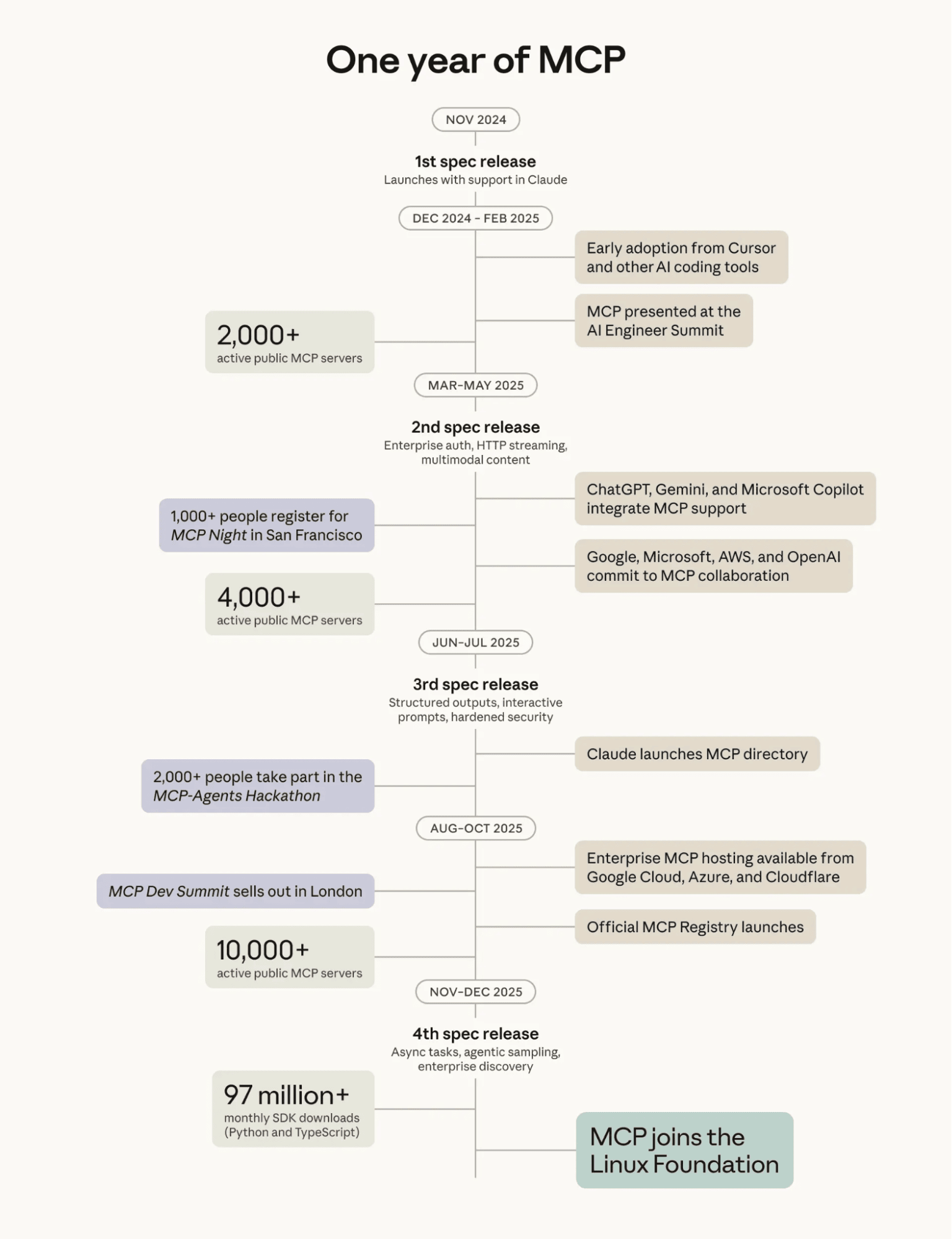 На фоне постоянных соревнований между компаниями эта новость стала неожиданностью. Anthropic, OpenAI и Block основали Agentic AI Foundation (AAIF) под эгидой Linux Foundation при поддержке Google, Microsoft, AWS, Cloudflare и Bloomberg. Главным взносом в этот «общак» стал протокол MCP (Model Context Protocol) от Anthropic, который уже успел стать стандартом для подключения к внешним системам — появилось 10,000+ публичных серверов, протокол внедрили ChatGPT, Cursor, Gemini, Copilot, VS Code.