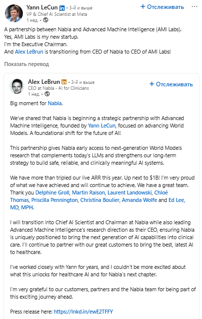 Амбиции у AMI Labs серьезные: компания планирует поднять €500 млн при оценке в €3 млрд ещё до (!) запуска продукта. Рулить операционкой в качестве CEO будет Алекс ЛеБрюн (сооснователь Nabla), а сам Лекун займет кресло председателя. Цукерберг проект благословил, но денег Meta не даст.