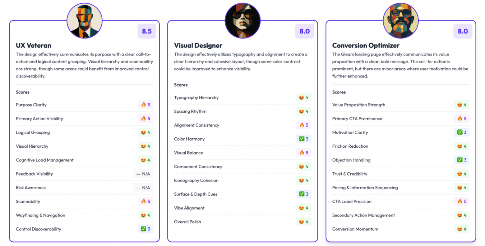 Gleam: симуляция дизайн-ревью. Десять AI-персон (от UX-исследователя до стратега) оценивают макет, выставляют баллы и формируют список приоритетных правок.