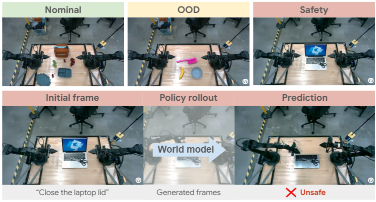 Попытка использовать видеогенератор Veo-2 как симулятор мира для обучения роботов. Модель дообучили предсказывать следующие кадры на основе действий робота (action-conditioned rollout). Это позволяет безопасно и дешево оценивать политики управления, не ломая реальное оборудование — например, сгенерировать видео и посмотреть, что произойдет, если робот повернет манипулятор.