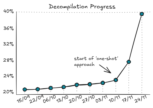 Я в последнее время экспериментировал с one-shot-декомпиляцией, используя режим Claude без пользовательского интерфейса в непрерывном цикле. Меня на это вдохновила статья о запуске Claude Code в цикле. Эксперимент оказался на удивление продуктивным.