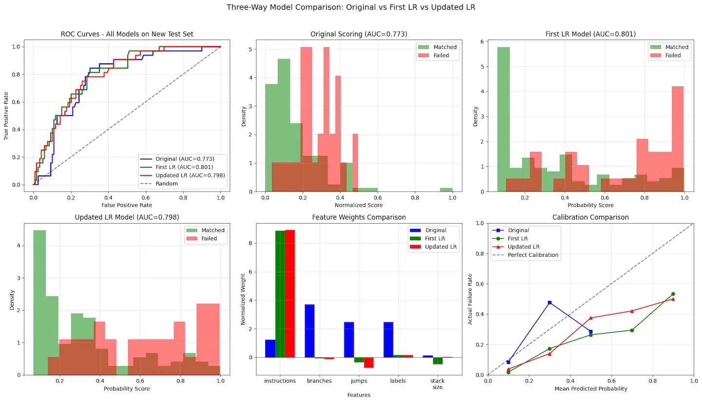 Такой подход к оцениванию функций поначалу показывал себя достаточно хорошо. А после того, как я залогировал сведения о нескольких сотнях функций, которые удалось и не удалось декомпилировать, я переключился на модель логистической регрессии, с помощью которой настраивал исходные веса системы, используемой для оценки функций.