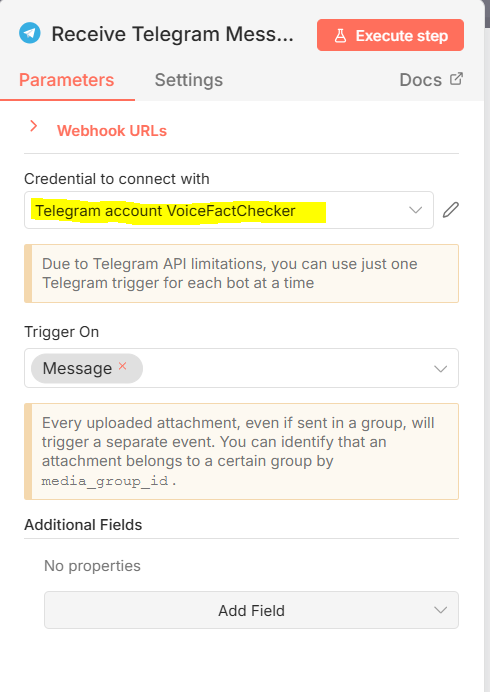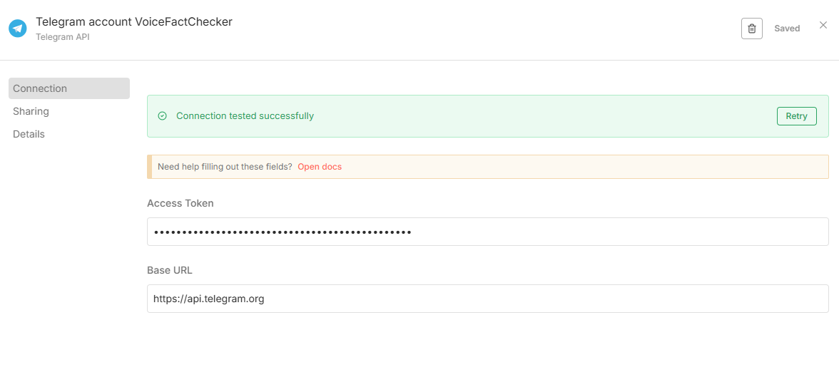Вставляем токен. Называем credential "Telegram account VoiceFactChecker".