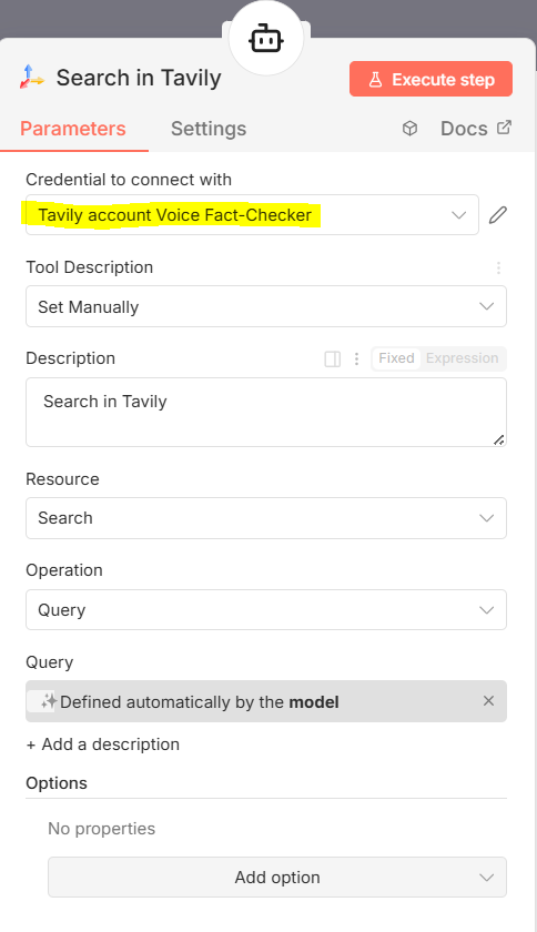 В ноде AI Agent создаем Tool Search in Tavily и указываем там "Tavily account Voice Fact-Checker"