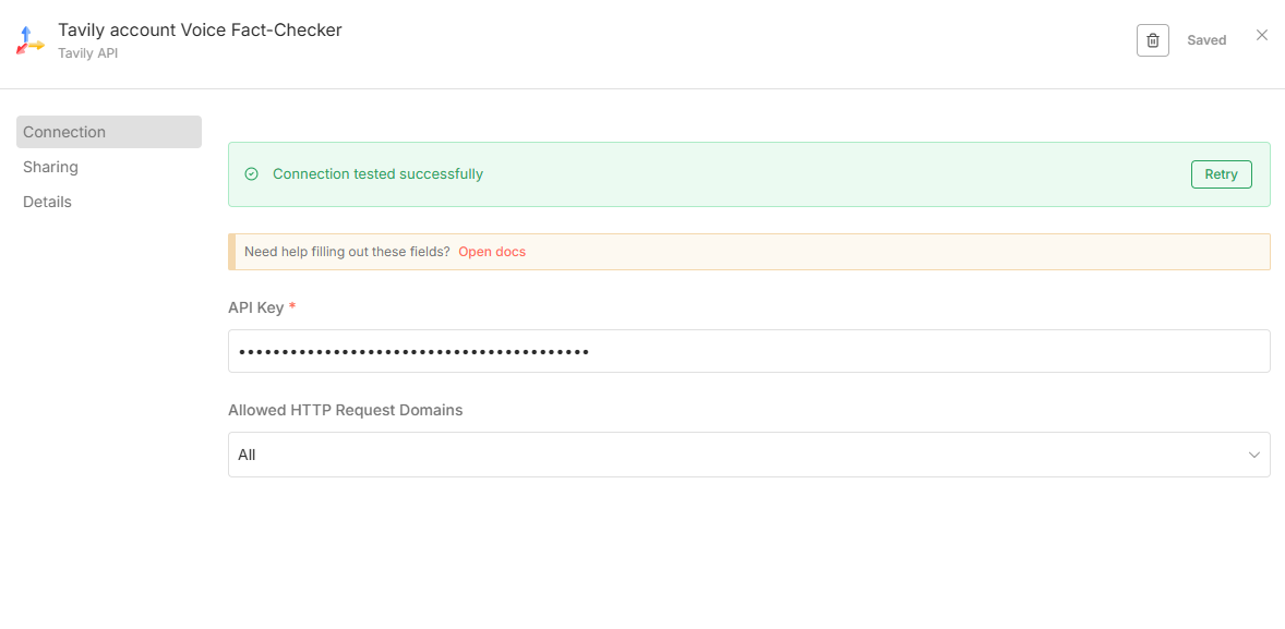Называем "Tavily account Voice Fact-Checker", копируем туда API Key.