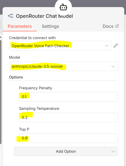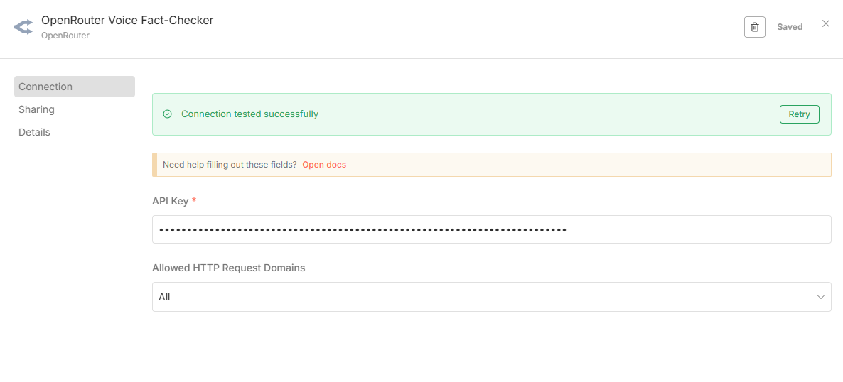 В n8n создаем credential: OpenRouter, называем "OpenRouter Voice Fact-Checker".
