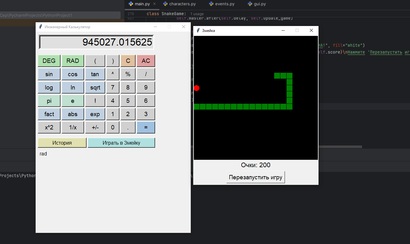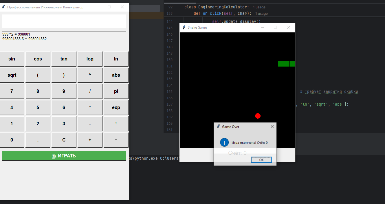 Ты - профессиональный программист. Напиши программу, реализующую инженерный калькулятор со всеми его функциями. Реализуй GUI, историю вычислений, все базовые функции инженерного калькулятора. Сделай дополнительную кнопку, с помощью которой можно запустить игру «Змейка» со всеми ее основными механиками. Язык программирования - Python.