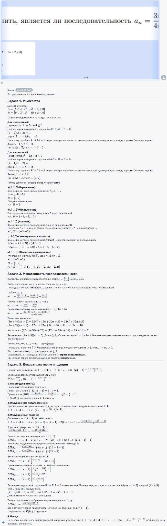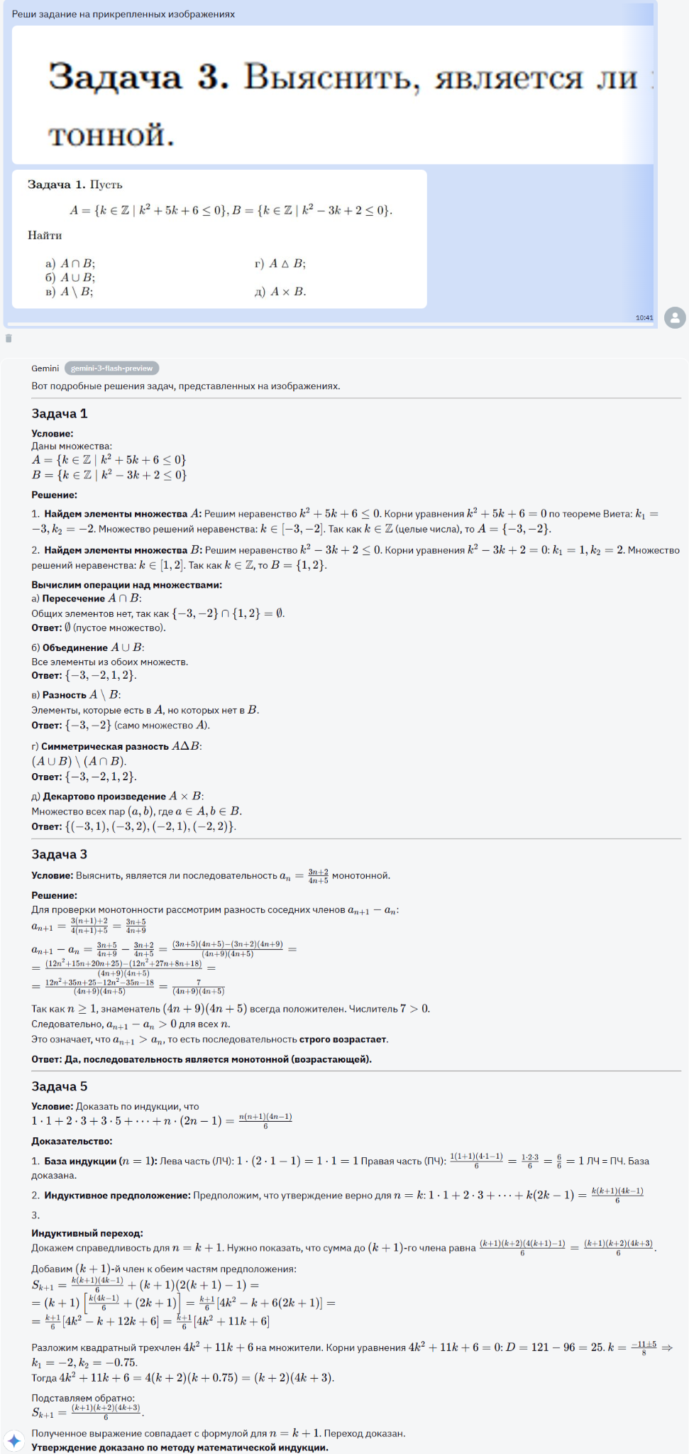 Gemini 3 Flash, как и Gemini 2.5 Flash, ошибается в первой задаче. Он опять-таки не получил начальных данных, не говоря уже о каких-либо операциях с множествами.