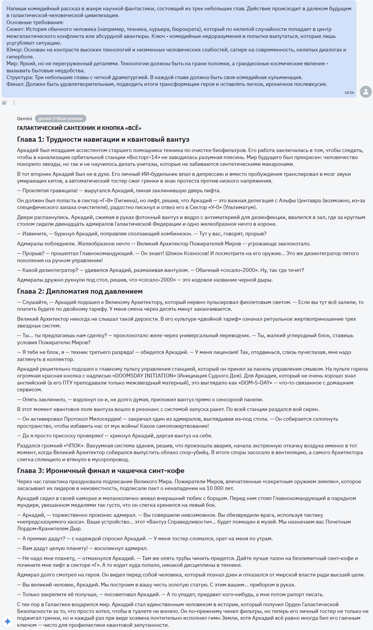 Рассказ от Gemini 3 Flash произвел на меня более приятное впечатление. Текст вновь хорош, да еще и комедийная составляющая появилась. Конечно, ее немного, но я бы даже записал это в плюс - избыток примитивного юмора мог испортить впечатление от рассказа.