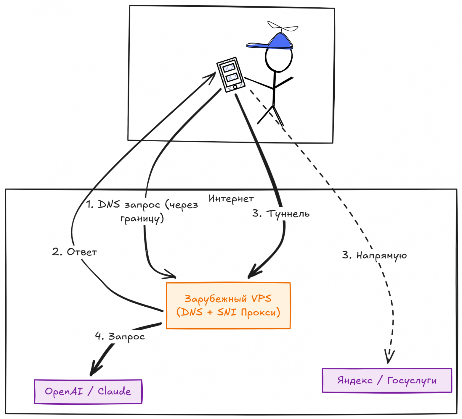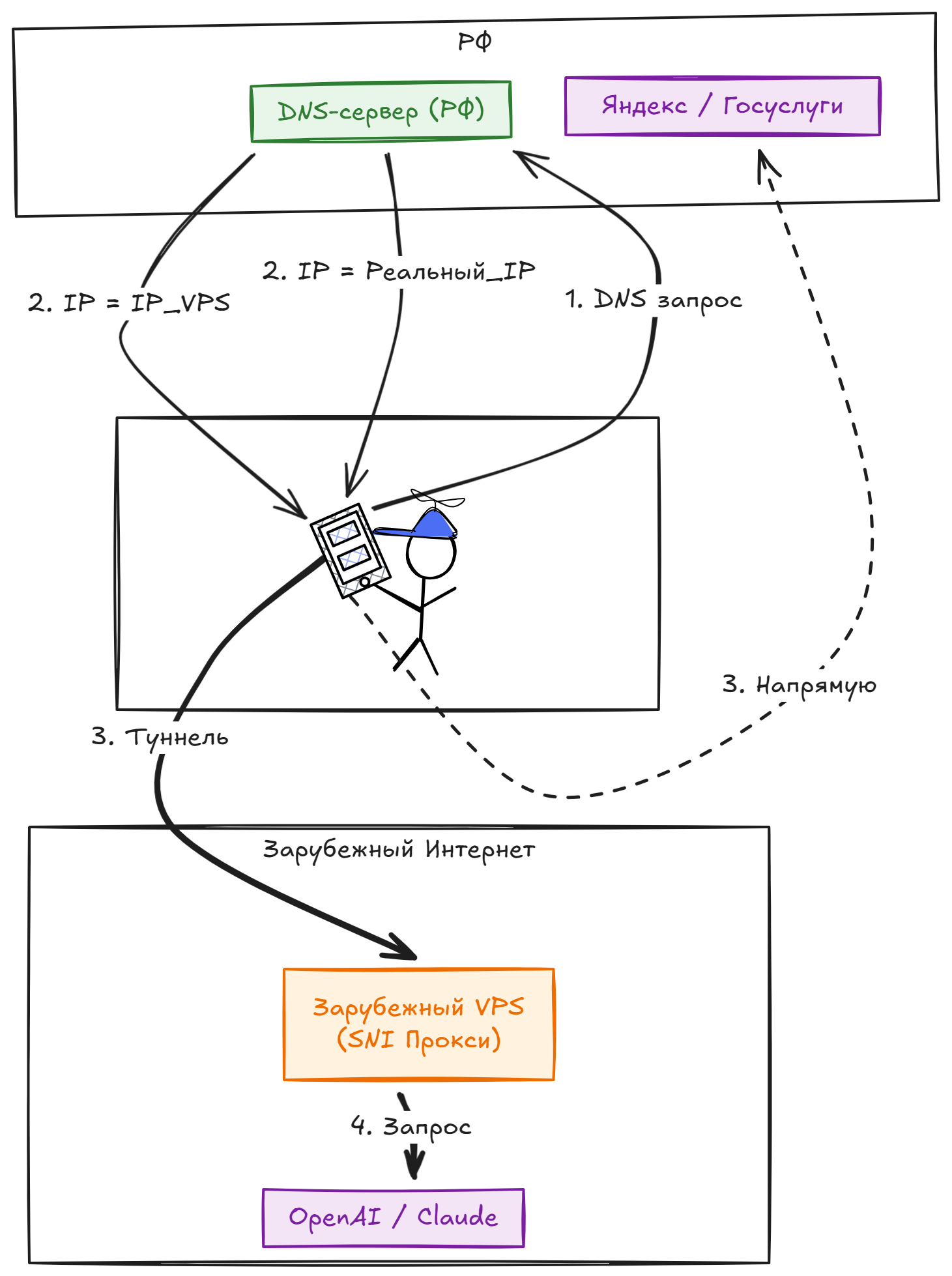 Как работает: Вы спрашиваете у российского DNS "Где Яндекс?". Он отвечает реальным IP Яндекса. Вы спрашиваете "Где ChatGPT?". Он отвечает IP вашего зарубежного сервера.